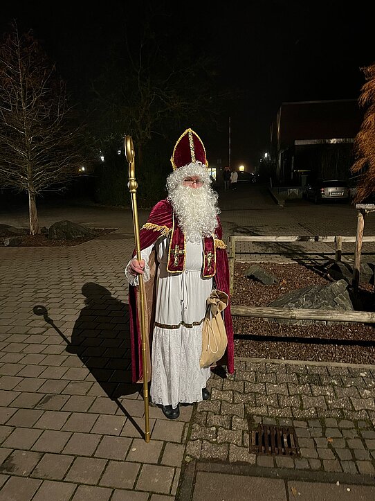Im Anschluss der Show besuchte uns der Nikolaus mit seinem bischöflichen Gewand. Er richtete aufrichtige und nette Worte an die Kinder. Gemeinsam wurde noch ein frohes Weihnachtslied angestimmt. Danach verteilte der Nikolaus mit Helfern wieder schmackhafte Weckmänner an die Kinder.